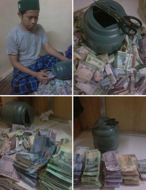 “Selama 1 tahun berhenti merokok dan memutuskan hidup single (tak pacaran). Jatah rokok sehari 15 rb dan uang kencan (pacaran) setiap bulan 300 rb, dimasukin celengan selama 1th gak dibuka. Pas dibuka uangnya ada 8,7 jt 15rb.